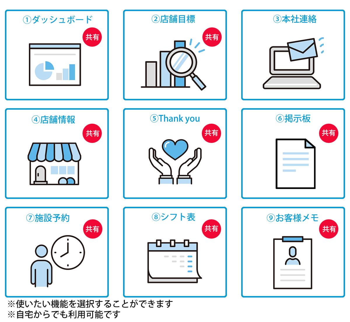 店舗に関する連絡事項、シフト表など共有し、伝達漏れや認識のズレ、引継ぎ漏れを防ぎます。