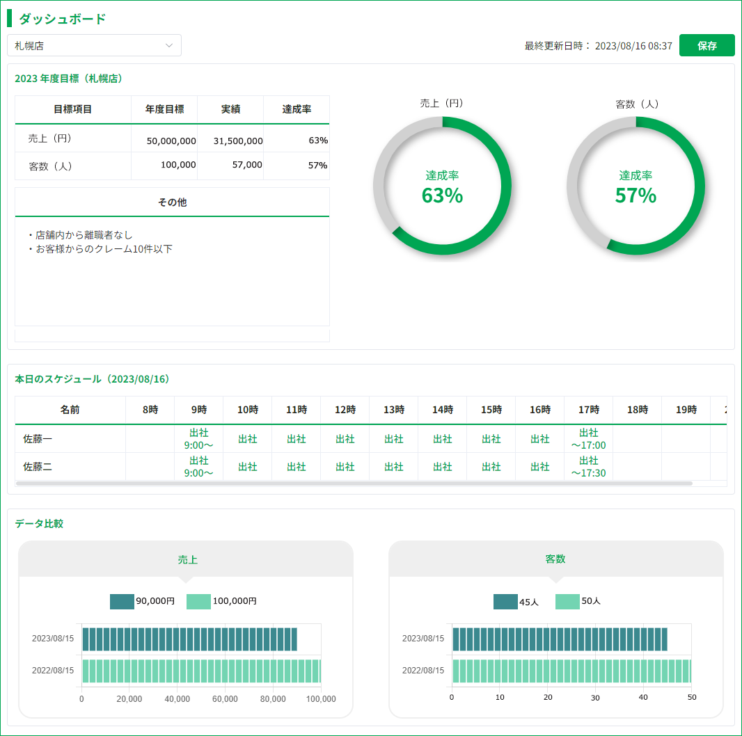 ①ダッシュボード[全社共有] 年度目標の達成率を表示、昨対比を表示、本日のシフト表を表示